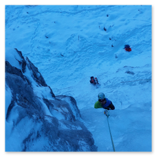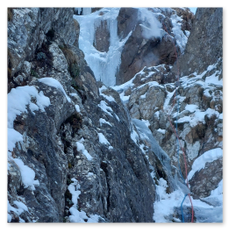 Materiale necessario: Nda per cascate di ghiaccio, sono inutili chiodi e friend, presenti soste nuove a Fix e anelli di calata